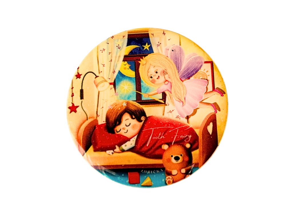 - na jedné straně barevný obrázek Zoubkové víly v dětském pokojíčku a text "Tooth Fairy" Zubička (kdo ho najde:))