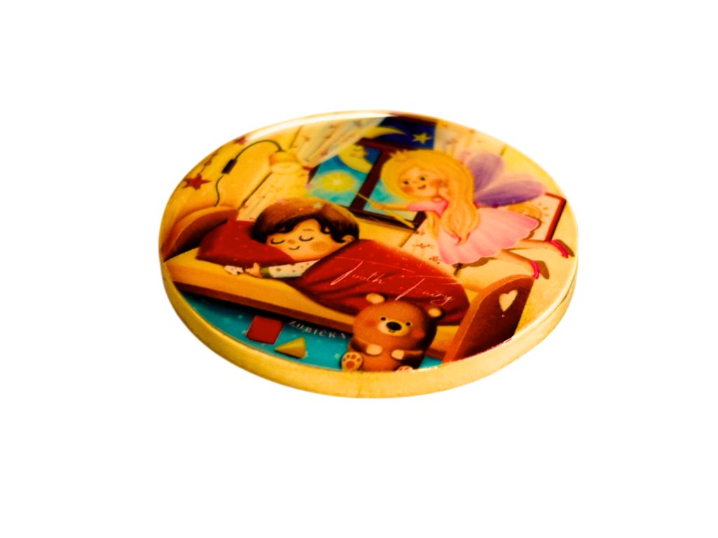 Bezpečnostní upozornění: Medaile Zoubkové víly jsou pamětní/dekorativní sběratelské předměty, nejsou určeny jako hračka. Nevhodné pro děti do 3 let - obsahují malé části. Nedávat do úst, nebezpečí spolknutí, vdechnutí, udušení. Plastová kapsle není hračka.